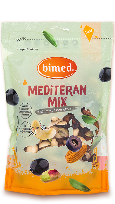 Mix mediterraneo. Una miscela di noci e olive secche.